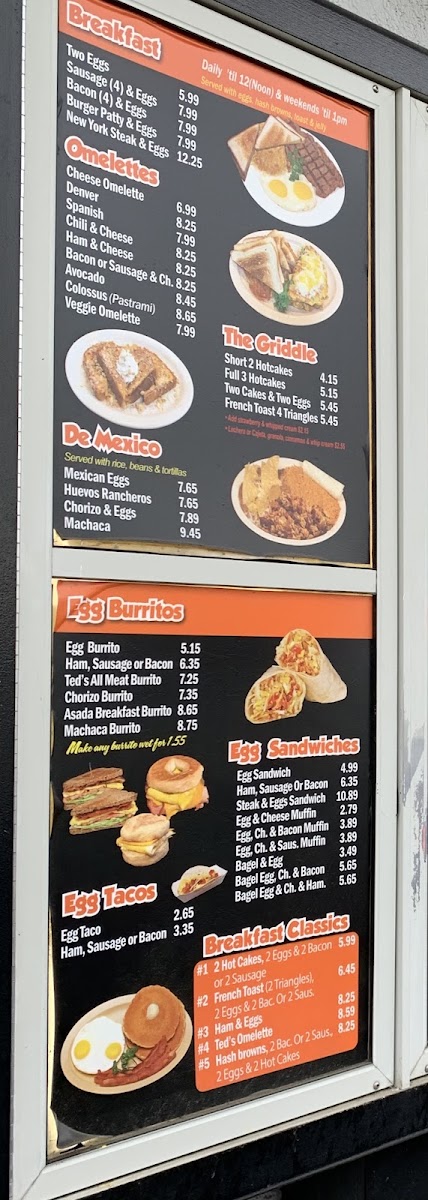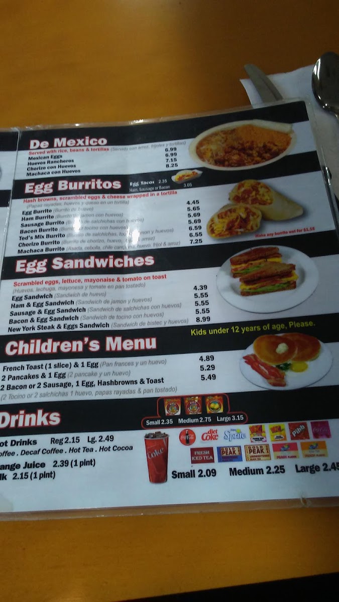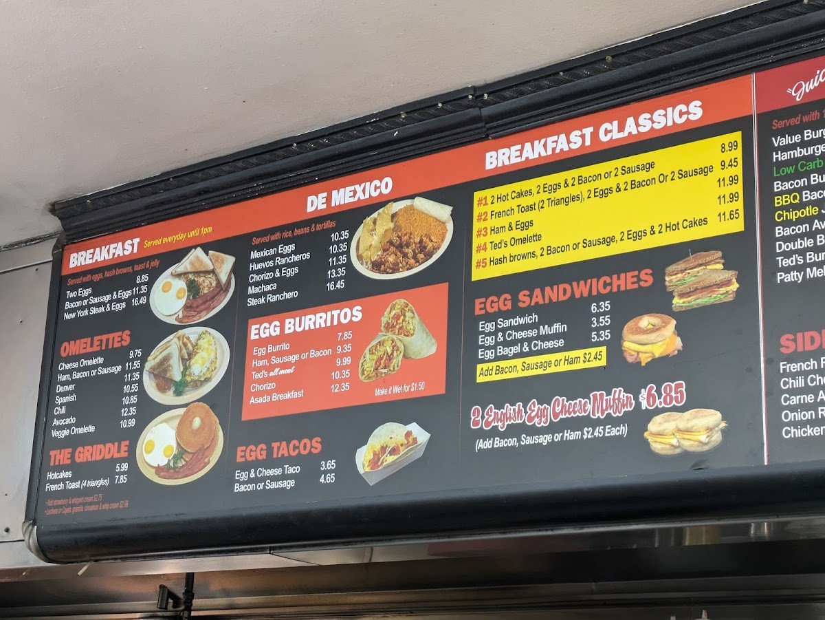- Breakfast Items: Classic breakfast dishes such as New York steak & eggs, pancakes, French toast, and Mexican-inspired offerings like huevos rancheros, chorizo con huevo, and machaca con huevo.