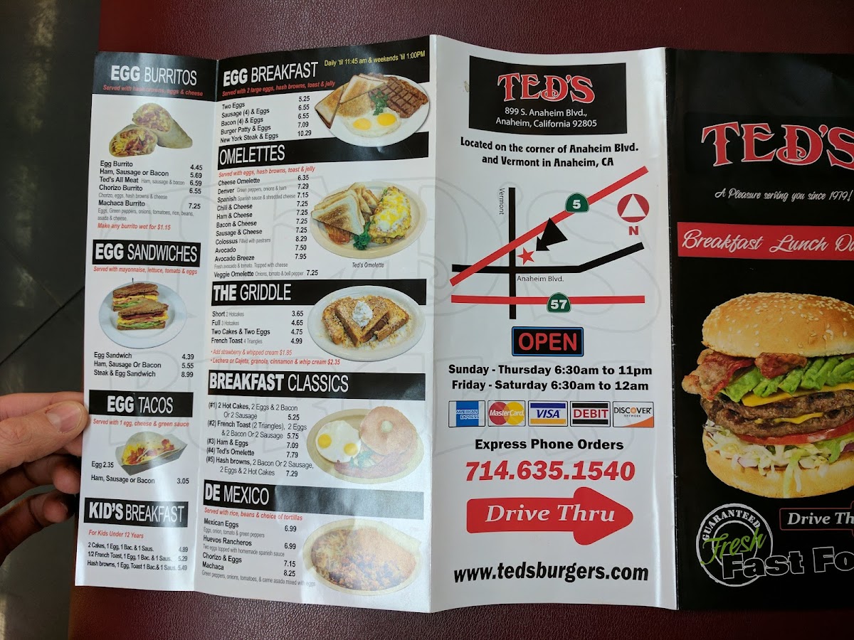 The menu offers a variety of American-style options with a focus on hamburgers, breakfast items, and fast food selections. It is organized into several key groups to accommodate different meal preferences and times of day.